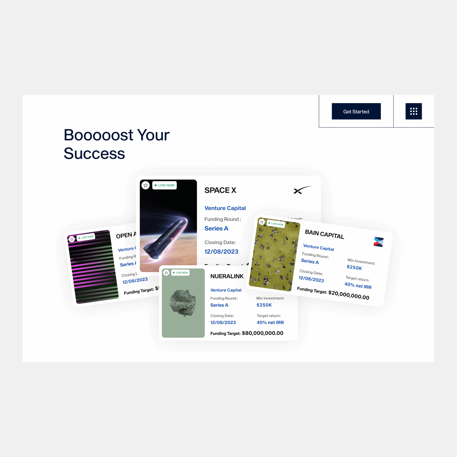 A Live Now card stack makes opportunities scannable at a glance so investors know what to explore next.