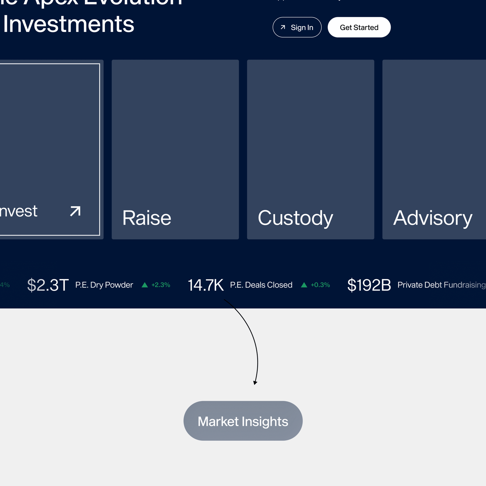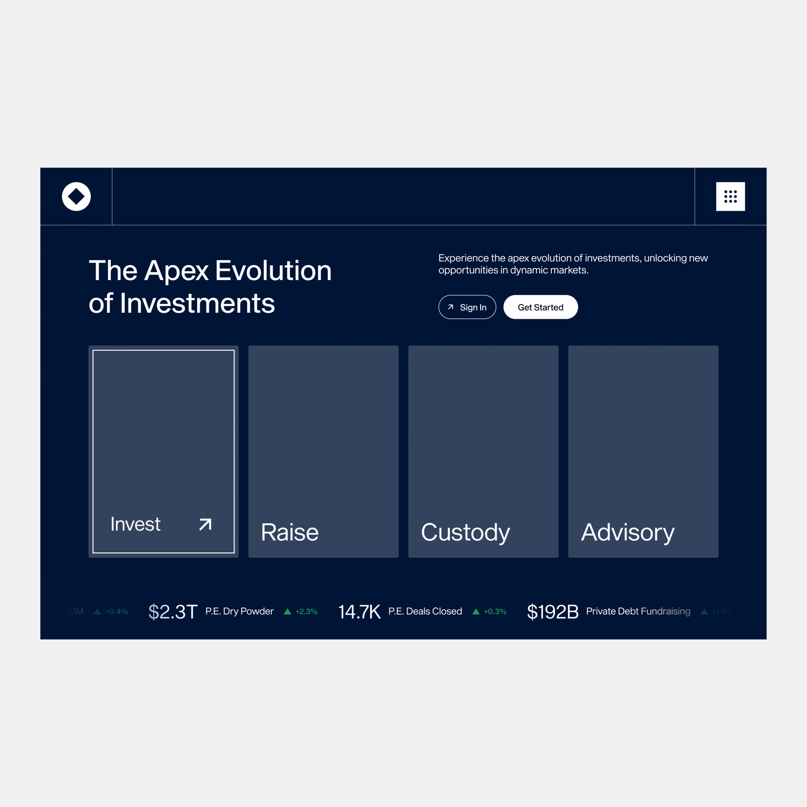 Invest, Raise, Custody, and Advisory each open into unique service halls with tailored content.