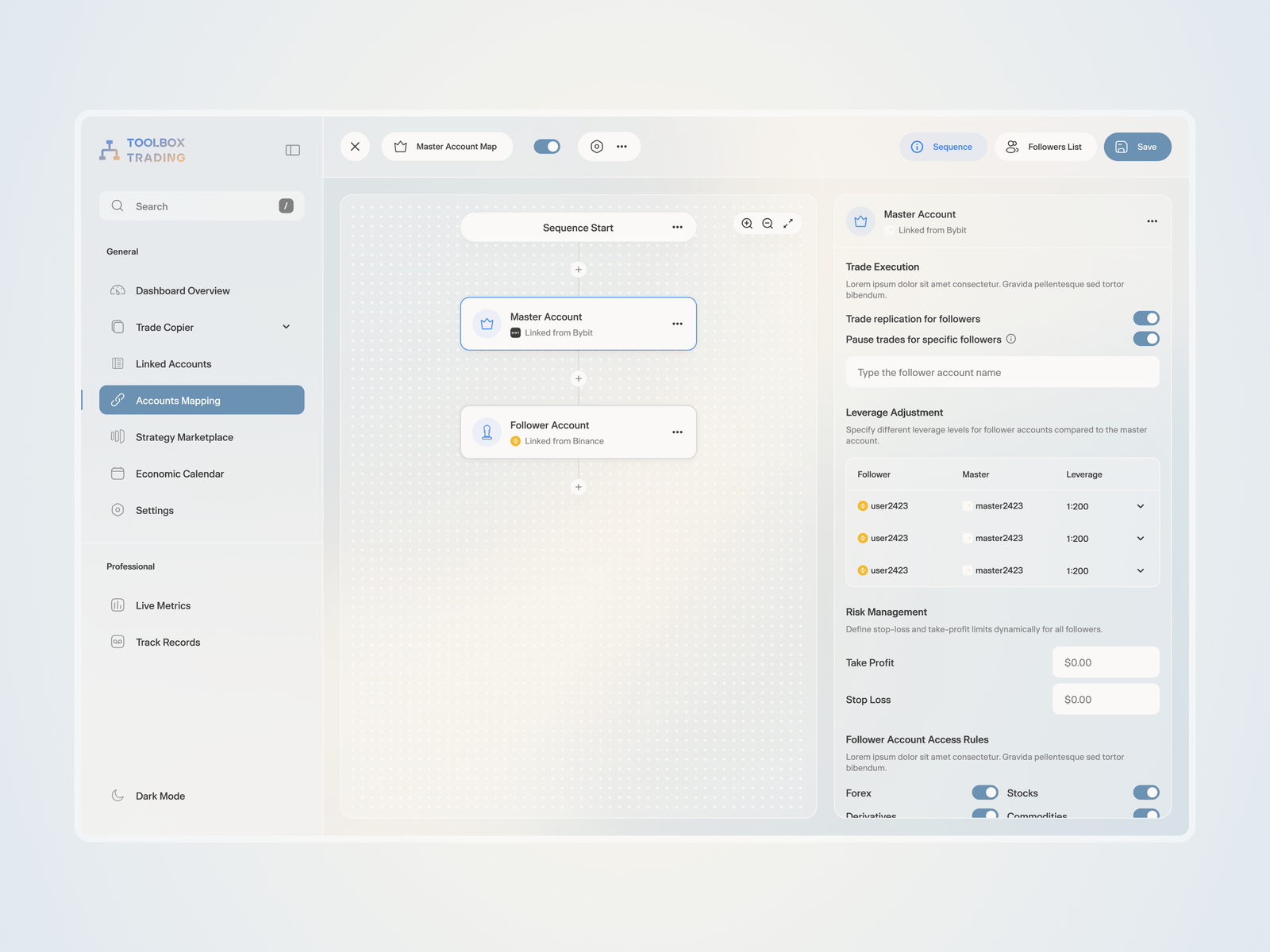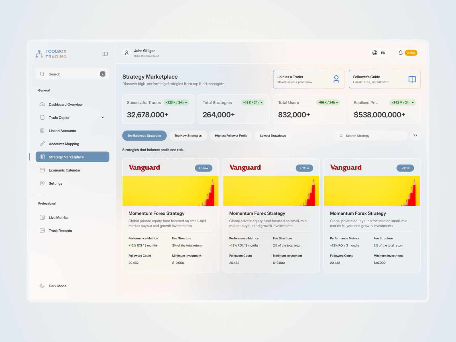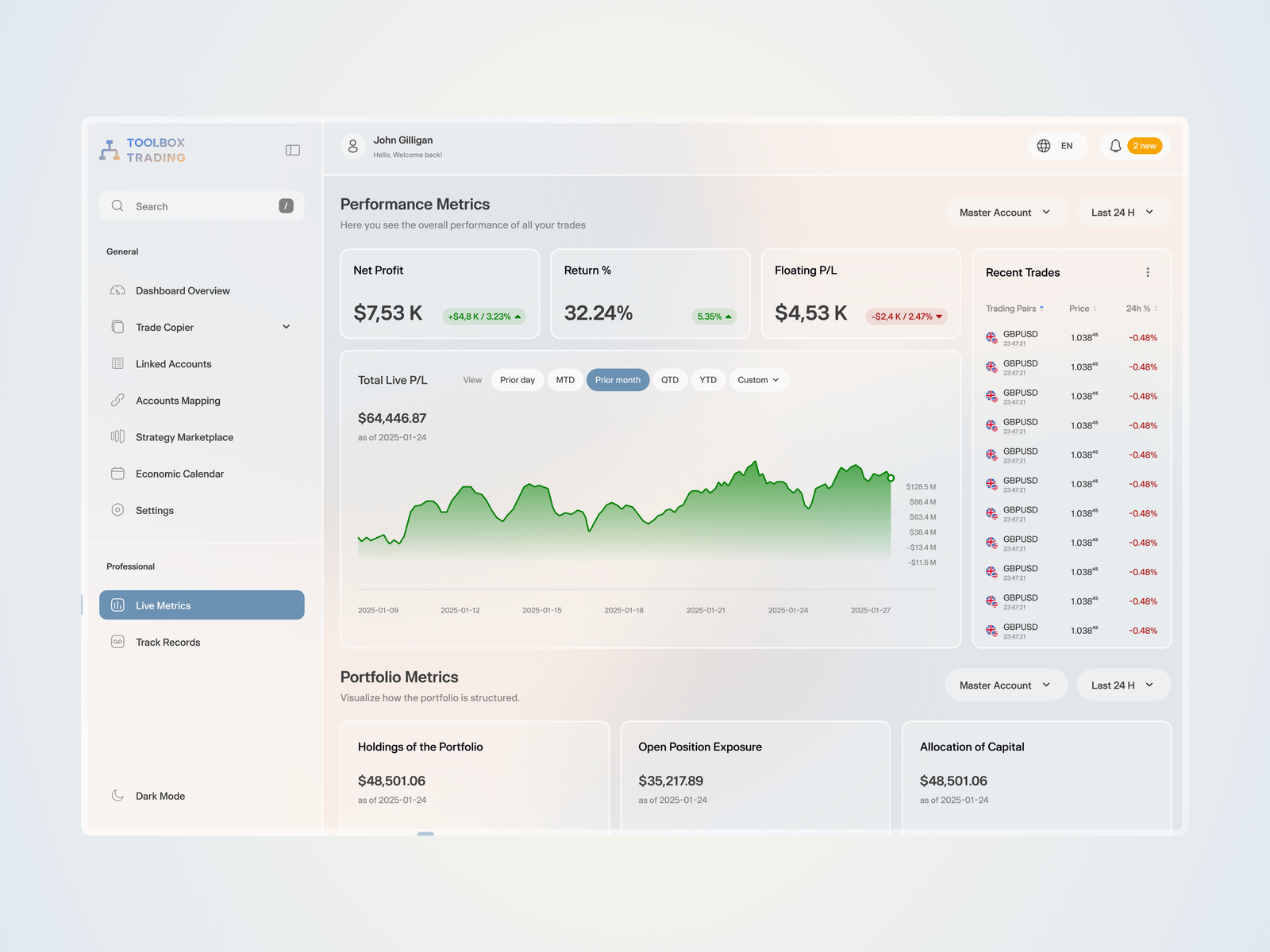 The Toolbox Trading dashboard blends sharp utility with modern performance. Built for high-stakes fund managers, it avoids gimmicks and prioritizes speed, data density, and absolute clarity.